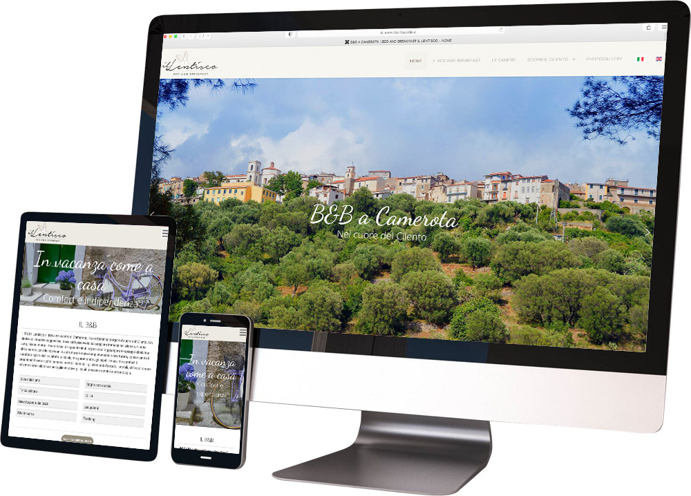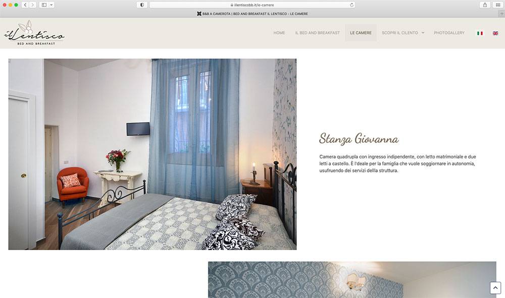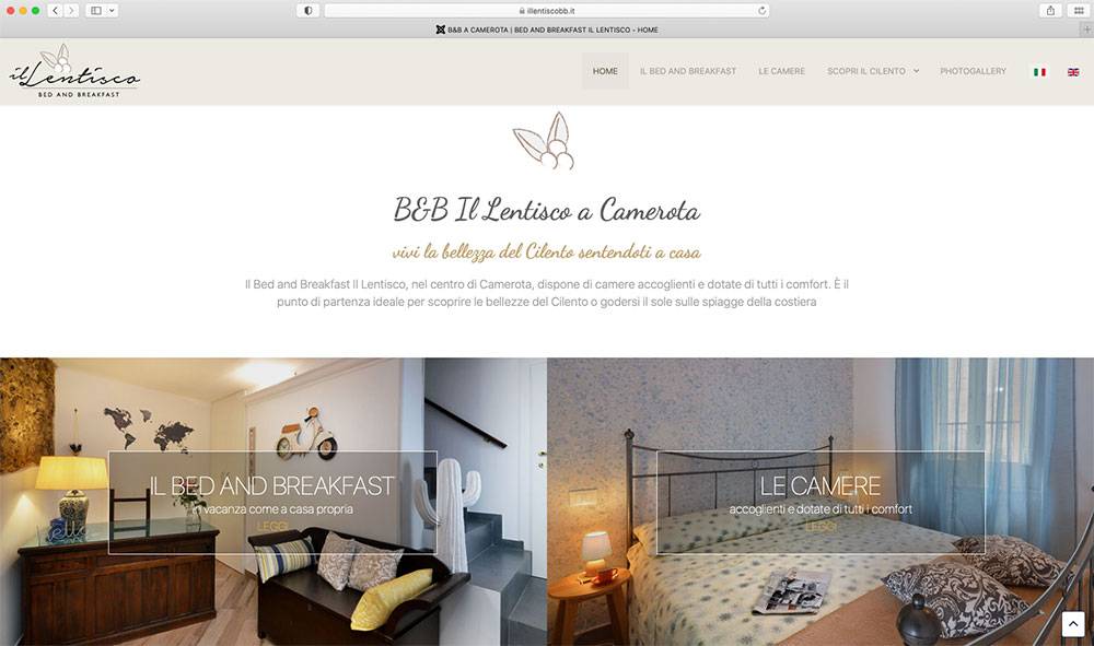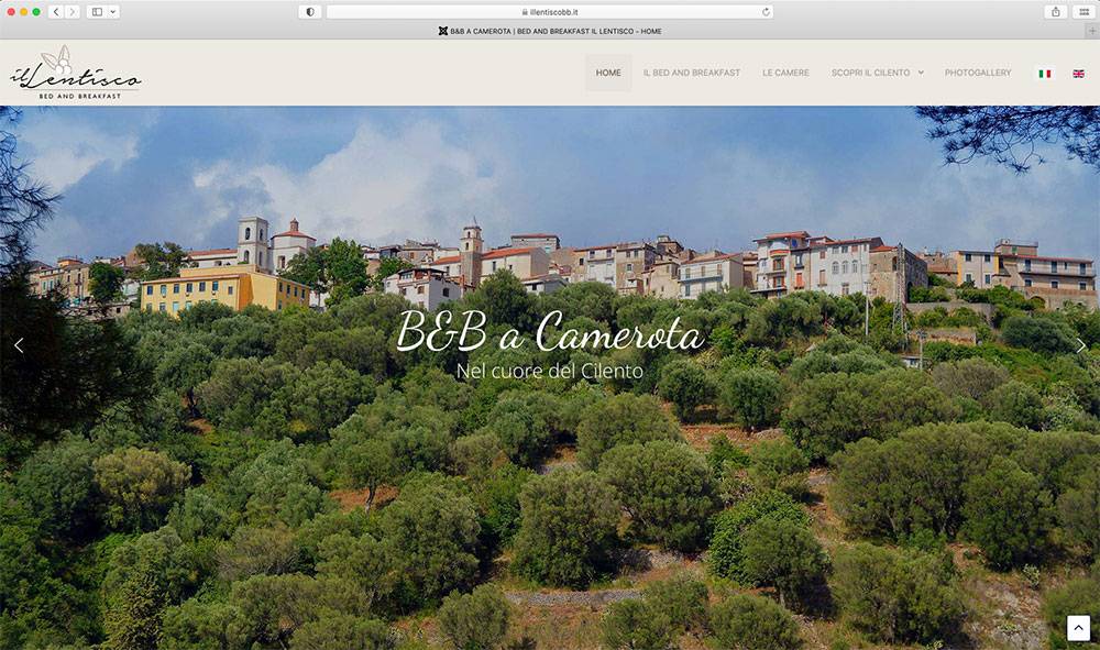 Il Bed and Breakfast Il Lentisco si trova nel centro del pittoresco borgo di Camerota, nel cuore del Cilento. I titolari, Felice e Gabriella, hanno ristrutturato con passione e con gusto una palazzina storica, conservando l'atmosfera particolare del borgo e dotando le camere di tutti i comfort necessari per garantire un piacevole soggiorno. Il B&B dispone di tre camere a cui sono stati dati i nomi delle tre figlie, sottolineando il carattere familiare della struttura. Gabriella si incarica di deliziare il palato degli ospiti proponendo, per una colazione gustosa, le sue torte e ciambelle fatte in casa. Per il Lentisco B&B abbiamo creato il logo, realizzato il sito web e realizzato il servizio fotografico.